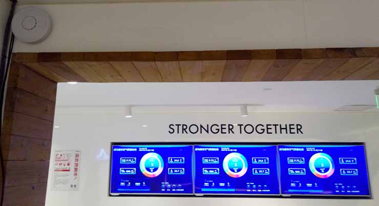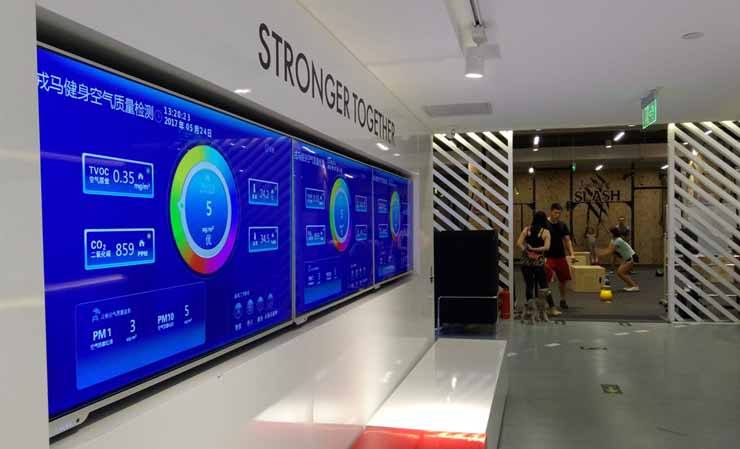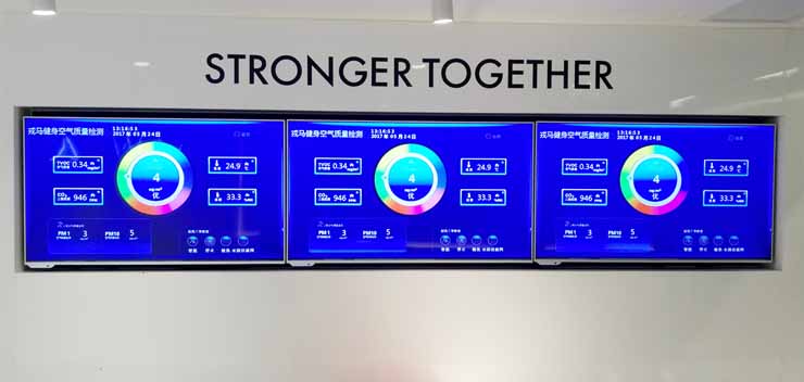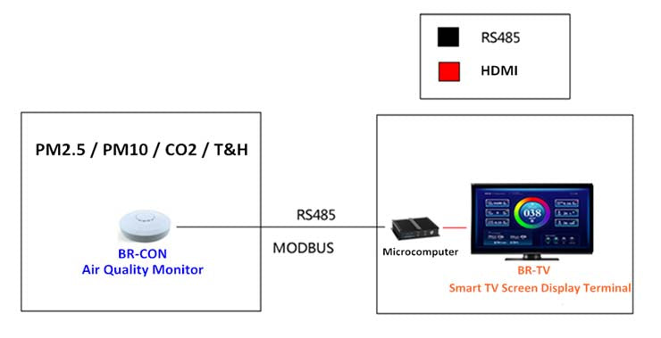 A BR-CON air quality monitoring probe is installed at the front desk of the gym, and the data is transmitted to the micro control host through the wired RS485 network, and the micro control host displays the data to the multimedia display through the high-definition line to realize the multi-screen display.